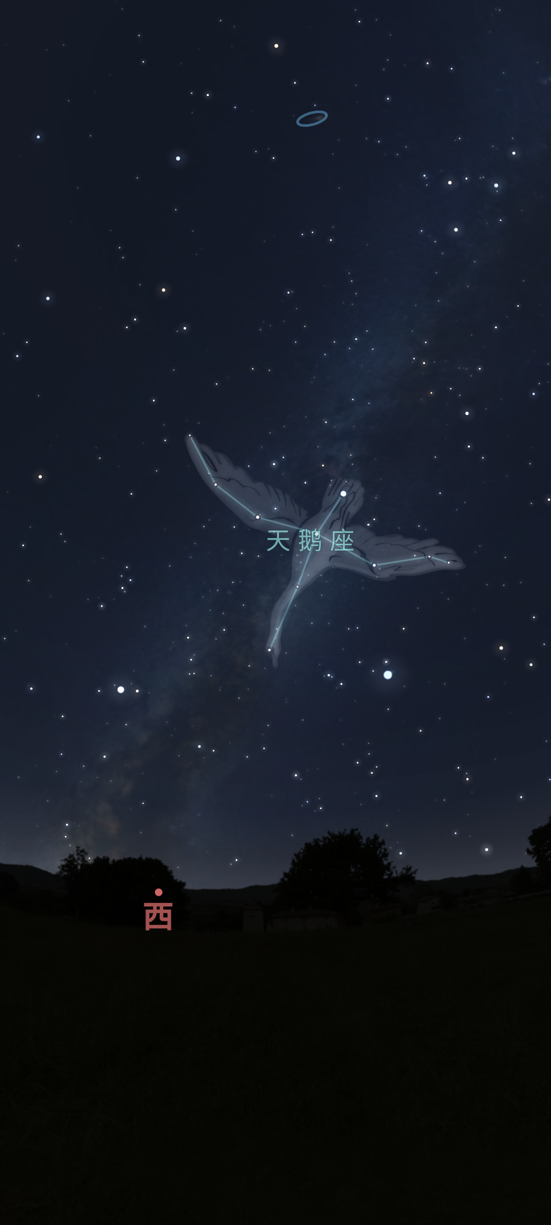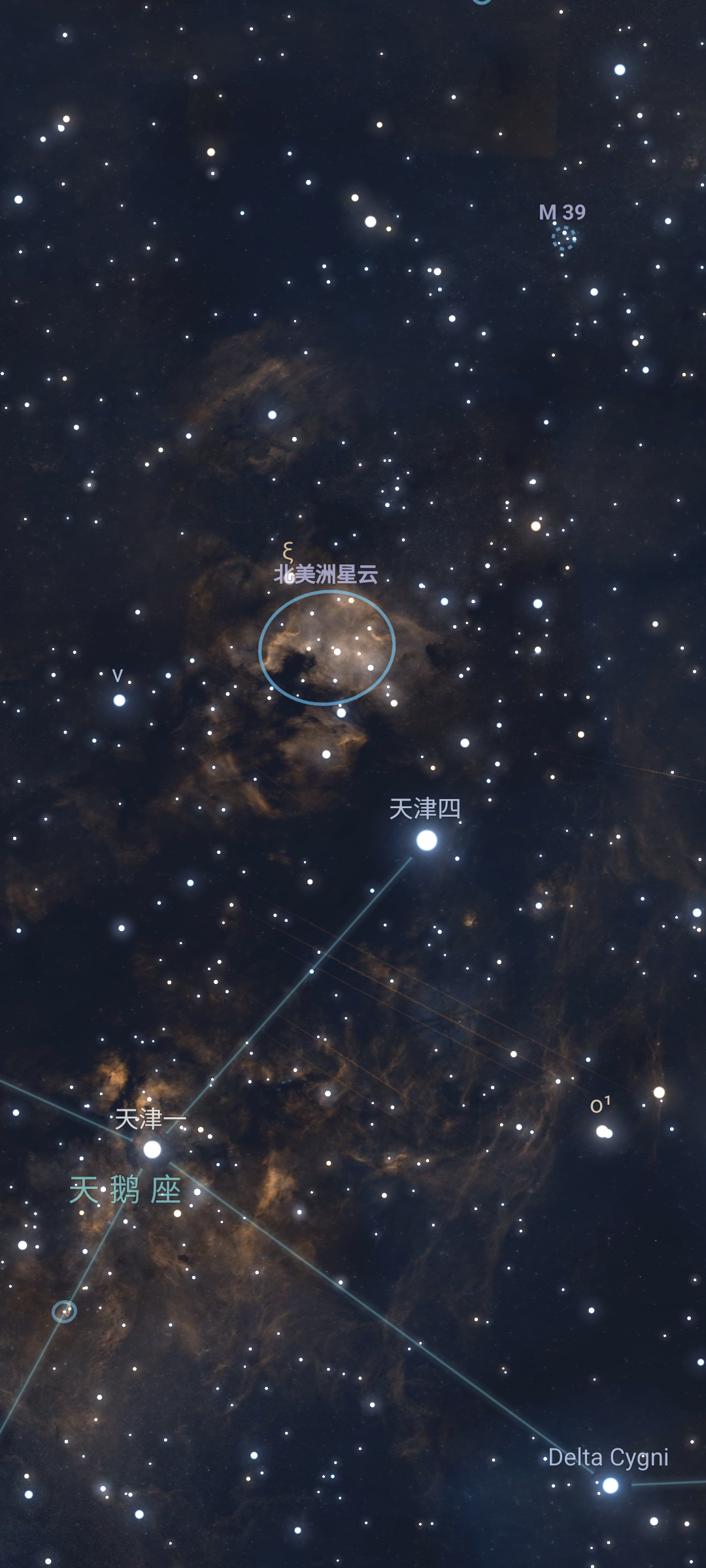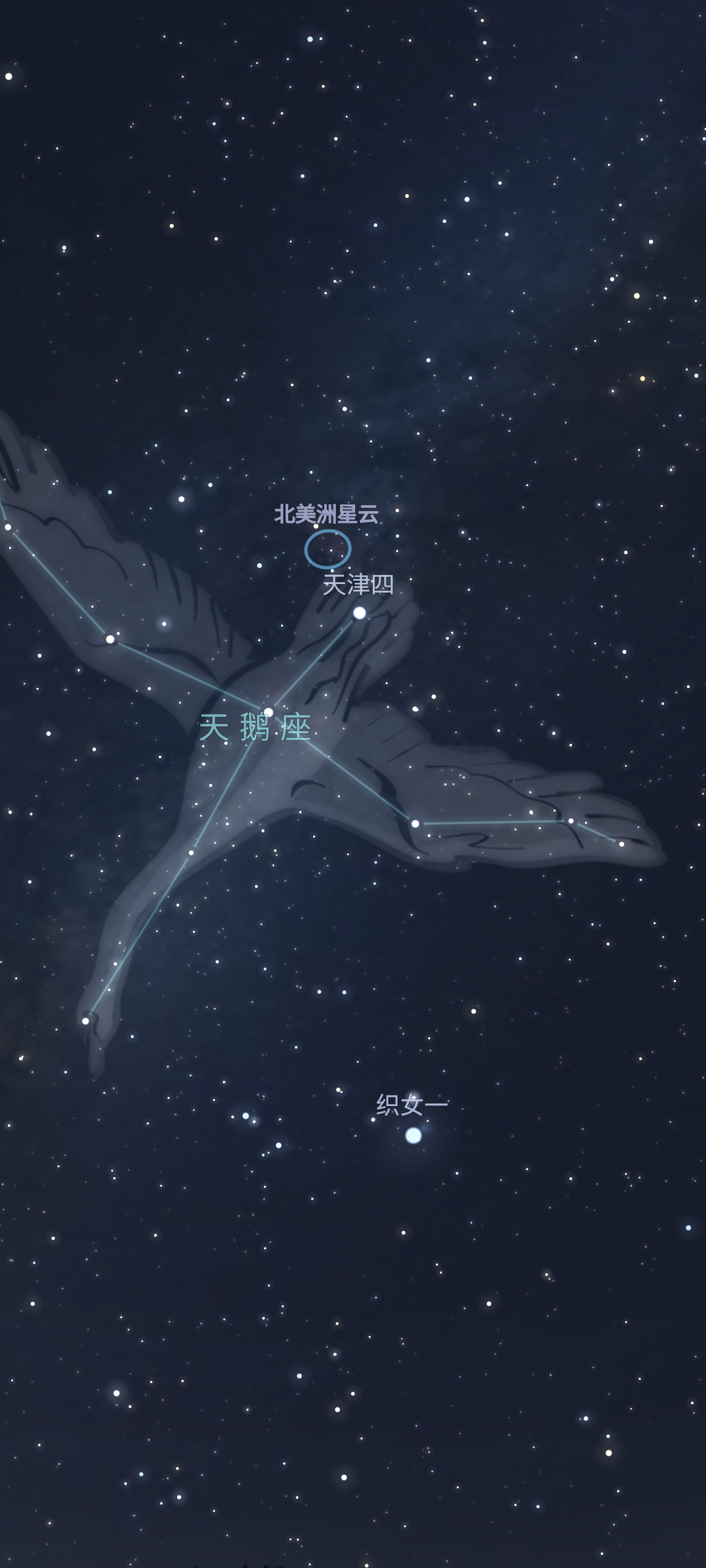 图七是天鹅座天津四及周围区域,使用双筒望远镜虽然无法直接观测到2000光年外北美洲星云的微弱红光,但银河系背景的大范围恒星得以透过星云显现,形成了从西南横贯东北,有模糊分界的银色丝带。